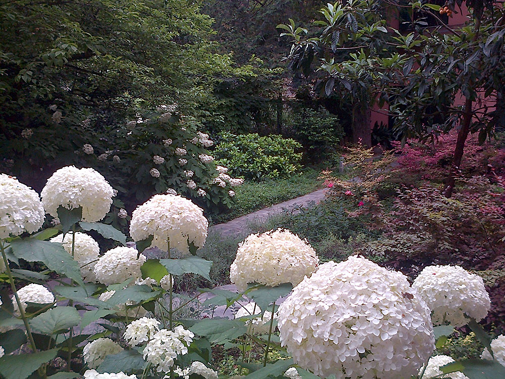 Una distesa di Vinca minor fiorisce di “pervinca” tutti i fine inverno, strisciando ai piedi di ortensie in diverse varietà, di Loropetalum chinense, di Osmanthus burkwoodii fino a raggiungere uno spicchio di giardino illuminato dal sole e coperto di rose.